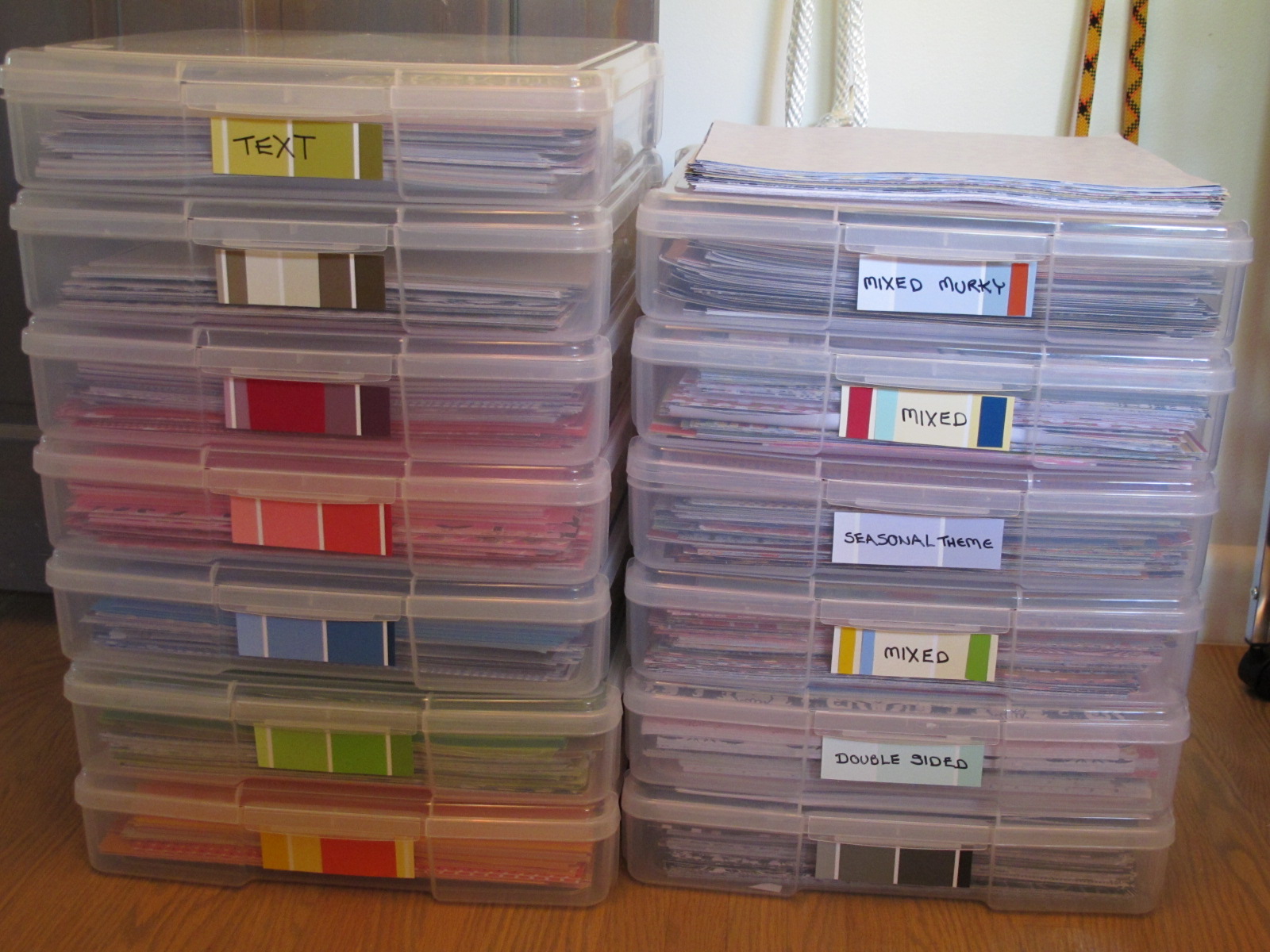 This is an example of how I spend my time. A few days ago I decided that I should sort out all my “scrapbook” type paper so that it would be easier to find and use. I debated for some time about how best to organize and after some deliberation decided to sort by color. Weight, texture and type of paper seem to be secondary in importance the way that I work. Since I had previously purchased clear plastic boxes at Michaels, I was able to start right away. I did an initial sort into color families and then divided further depending on the volume of particular colors. There are several containers of “mixed” with papers that are too colorful to defy classification. Now all I need to figure out is where I’m going to stash them! The trick is finding somewhere convenient, accessible and out of the way. If you’ve seen my studio and annex spaces, you’ll understand my dilemma.