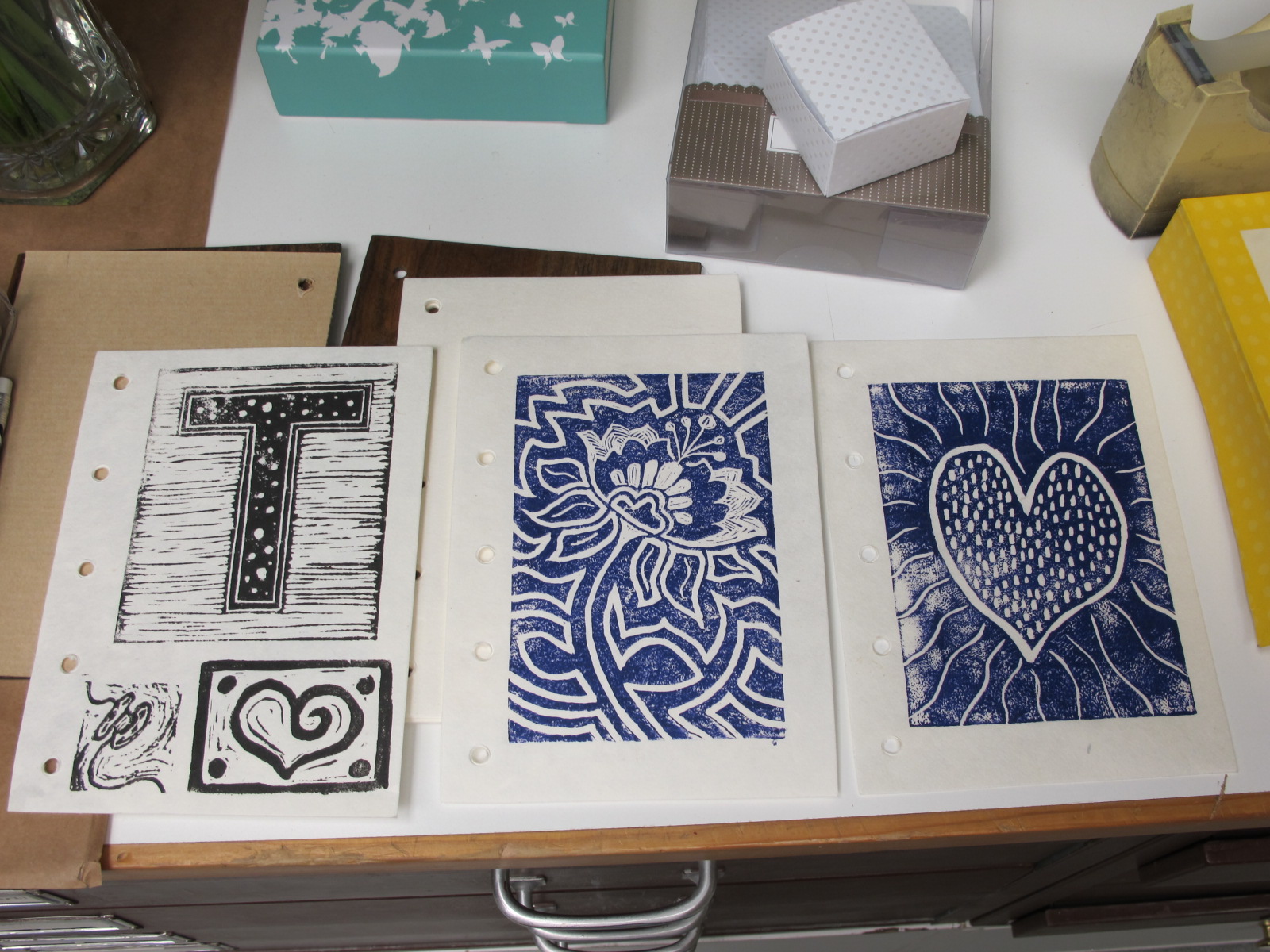 Here’s a shot of a portion of the evenings work laid out to dry in a big drawer. Ink printed 0n shiny cardstock takes awhile to dry, so I won’t get to photograph them or take them home till tomorrow. I’m happy with the results of the printing and feel like I learn something new every time we print. So far I’ve only used water based ink. I can’t bear to deal with the clean up of oil based products. I’ve tried a variety of papers and enjoy the results of experimentation. Good thing.