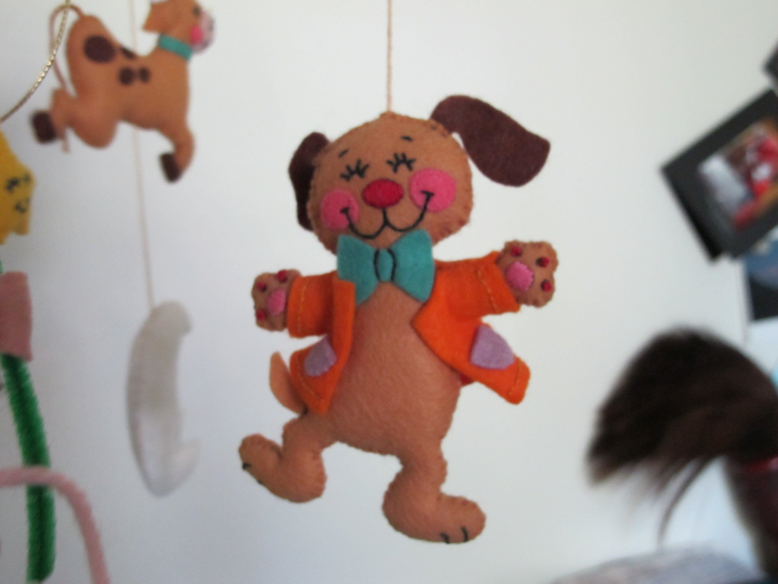 The cat and the fiddle. The cow jumped over the moon. This rhyme has been around a long time, and it’s always been a favorite of mine. I made this mobile from a kit over 30 years ago and I remember how much I enjoyed stitching each character. I think the design is timeless. This mobile hung over my daughter Devon’s crib for a couple of years. She is now 31. You might be wondering why I’m posting this, but let me explain. Over the years, several of the mobile pieces were pulled off and carefully put away – not always in the same place. It took a few years for all the pieces to find each other. Then I never found the time to stitch them back together. This mobile has been in pieces in a bag for approximately 25 years. I was cleaning my studio when I came across the bag. It was now or never – time to repair. (Someone asked me why I still had this, but I don’t like throwing things out, especially hand crafted things.) So, the next time Devon is home for a visit, I’m going to give her this mobile. After all, I did stitch it for her.