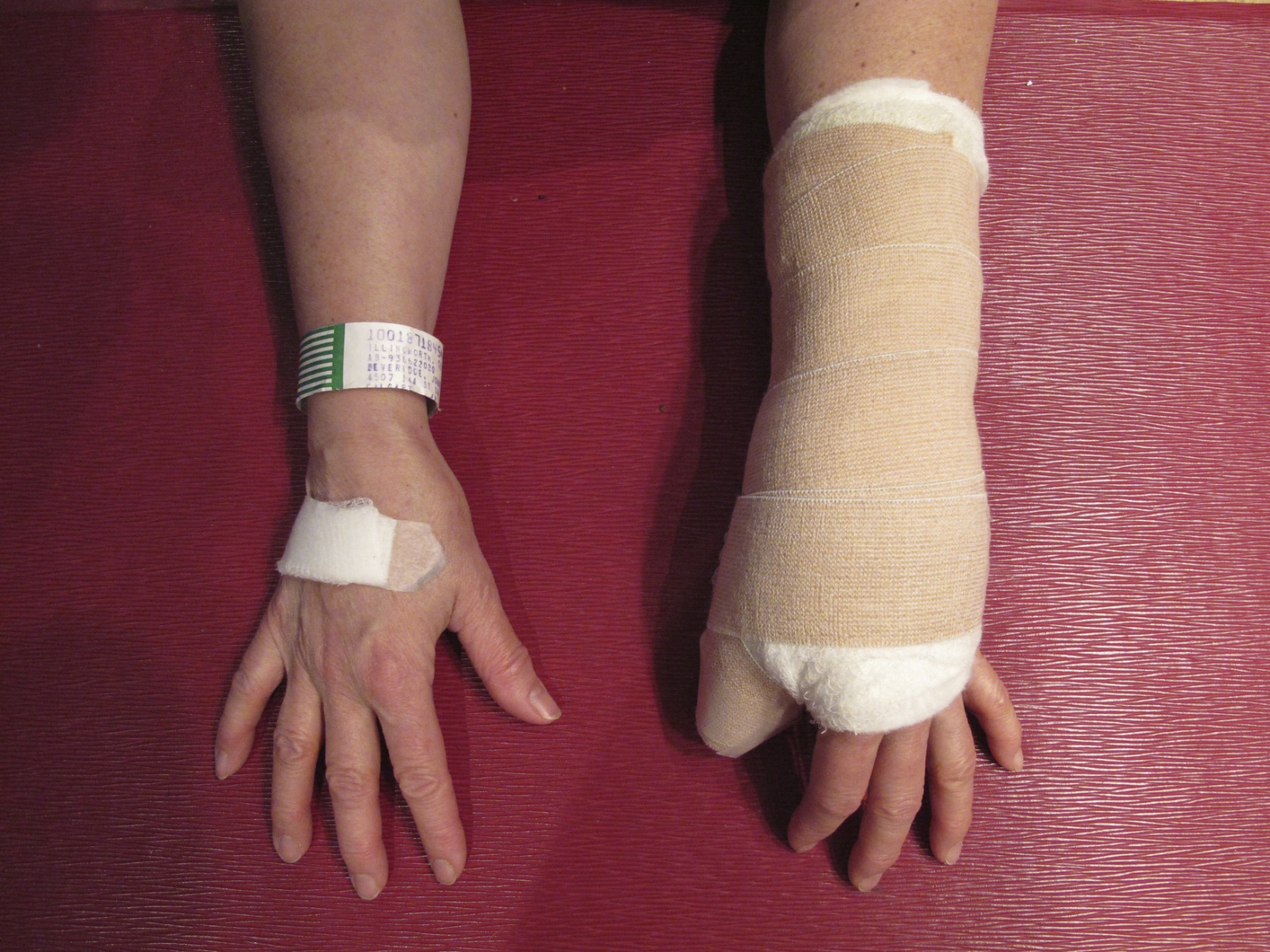 Finally I made it into the surgical suite (where I was a asked for my name, birthday, procedure (carpo-metacarpal arthoplasty) and location (left hand) one more time for good measure. My surgeon, Dr. Beveridge, drew a line on my hand to mark where to make the incision. I think he was trying to get it to match the one on my right hand. Dr. Rubin gave my right hand some freezing and an i.v. with drugs to relax. Good drugs. Then he put an i.v. in my left hand. Next he took rubber banding and wrapped my left hand and arm, starting at the fingers and ending towards my armpit. That was the most uncomfortable and painful part of the procedure. A super blood pressure like cuff was applied to my upper arm as a tourniquet and the rubber banding was removed. (That hurt too.) The freezing that was put into my left arm made it feel like my hand was on fire for a few minutes. After a few more minutes, the actual surgery started. At least I assume it did. There was blue paper draped in front of my face so I couldn’t see a thing. I felt a bit of pulling on my arm at times, but I can’t remember what Dr. Beveridge said they were doing to cause that. (Remember the sedation thing?) I chatted away throughout the entire procedure – having no idea of the time. Finally I realized that there was talk of stitches and that they were almost done! The drape was removed and I could see my hand with stitches and the end of the metal pin that was inserted for stabilization. I watched Dr. B. put on kind of half a cast, with padding and wrapping to keep it in place. Here’s a photo of the cast type wrap. It’s not the best looking thing, but I’ll only have it on for the rest of the week.