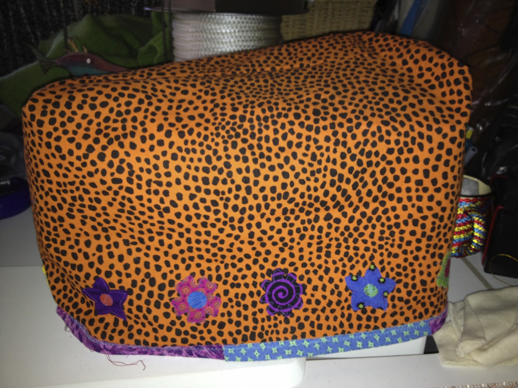 I like to try to keep my studio clean. This is a gargantuan task, considering the massive amounts of stuff in my studio. Don’t get me wrong – 98% of this stuff is really good stuff – there are just mountains of it. Since there is too much stuff to dust easily, I have made dust covers for a number of items. These include my sewing machine, my computer monitor, my external hard drive and my Ott light (with magnifying lens). I sewed and appliqued with materials that were close at hand. Here are the results: