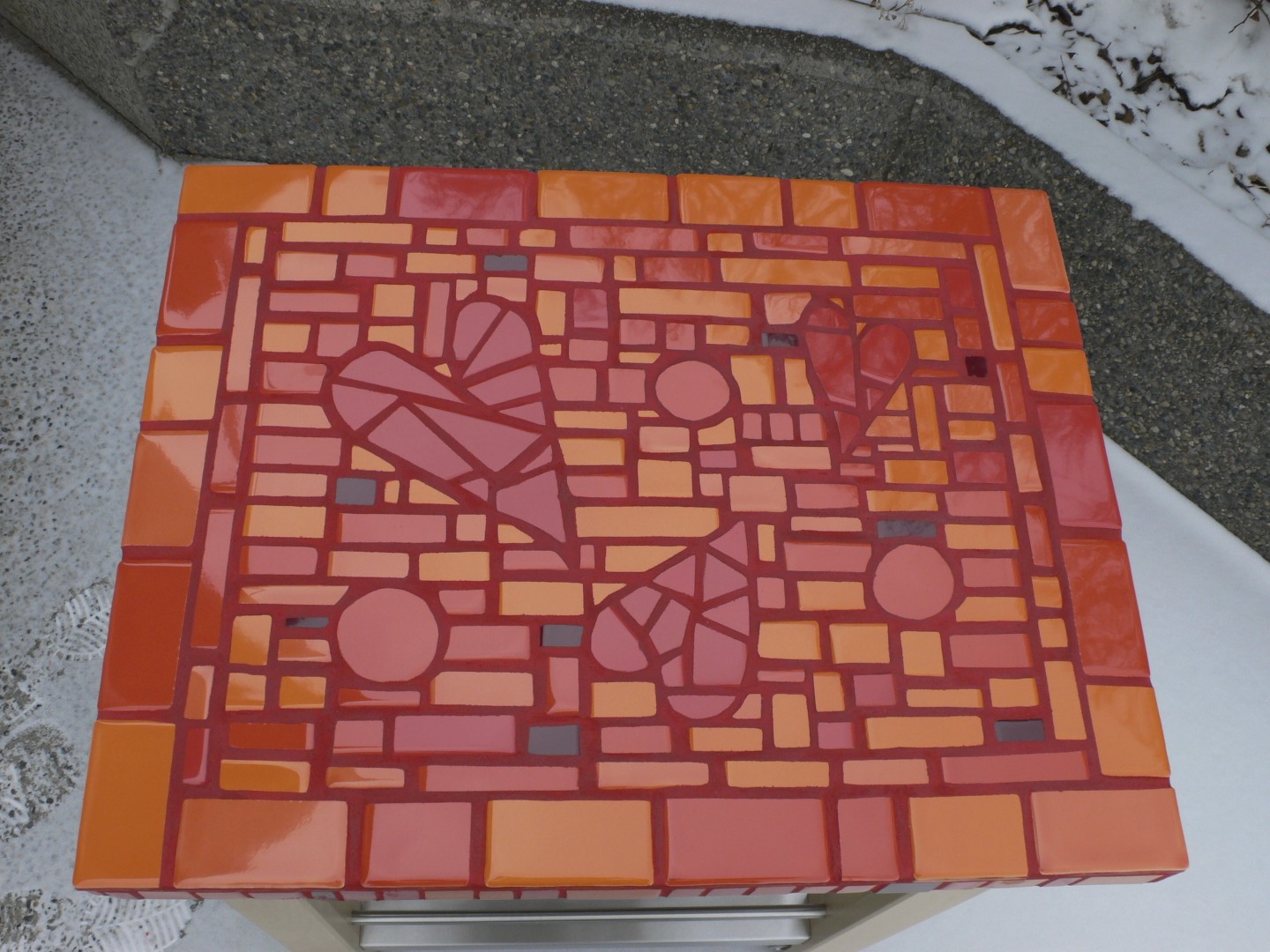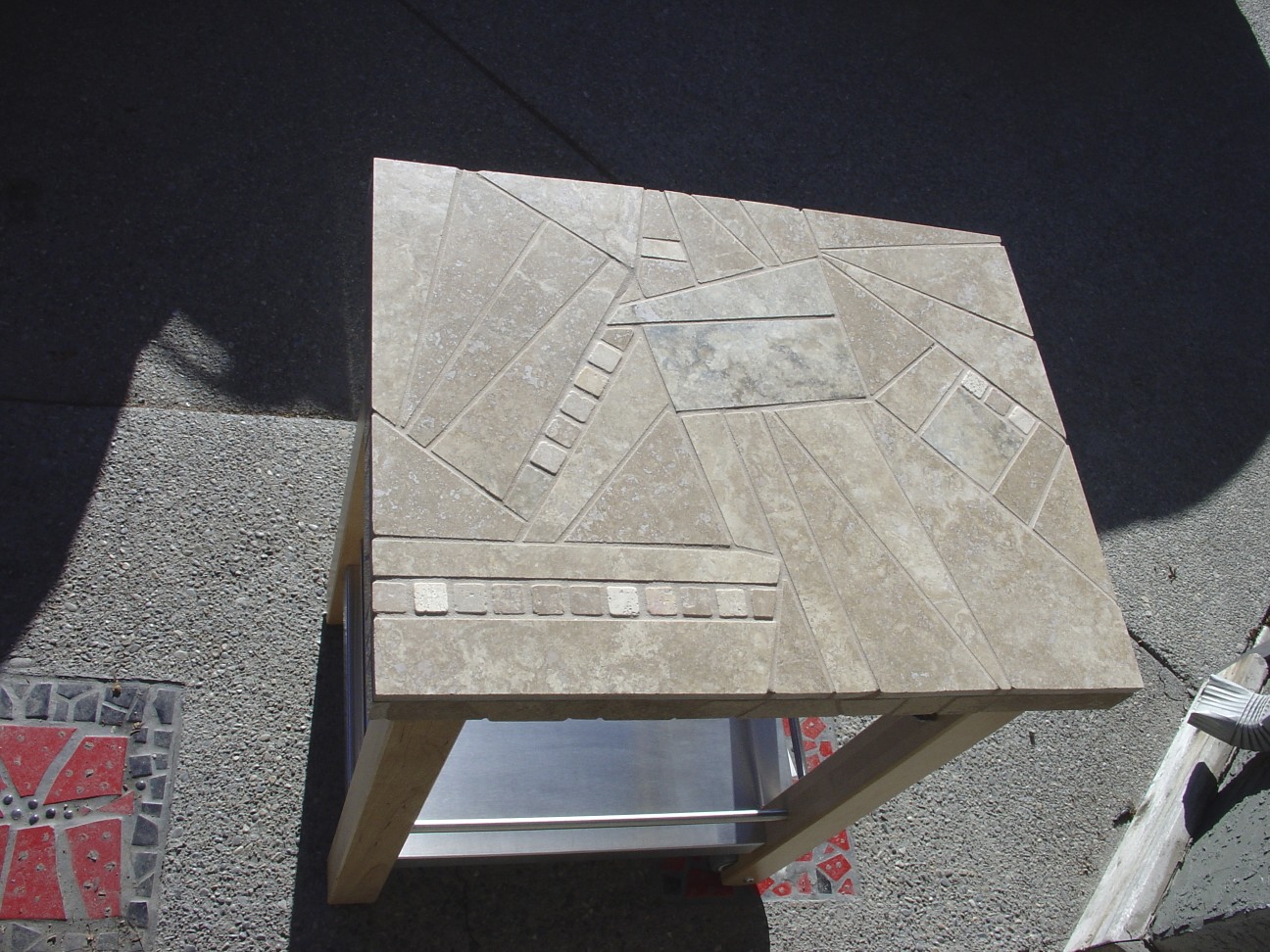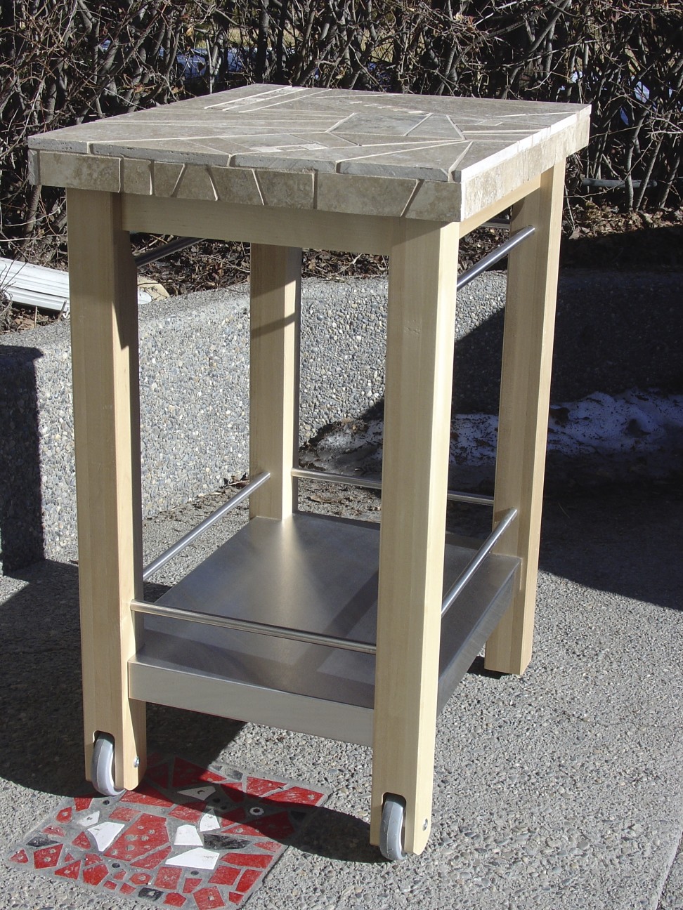 In years past when I was busy doing tile mosaics, I created 3 pieces for charity events. Two were for fund-raisers for the Alberta Children’s Hospital, and one was for a school that my children attended, Calgary Academy. I tiled the tops of two kitchen carts. These were Ikea carts that came with butcher block tops. The tops were replaced with new wooden tops that were slightly smaller so that when the tile was applied, the proportion would still be correct. The first piece was done in limestone which I cut and pieced like a puzzle. The stone was donated and it was a challenge for me to work with such subtle color. I’m not really know for “subtle”. The red, black and white tiles visible on the ground are mosaic inserts in our driveway.