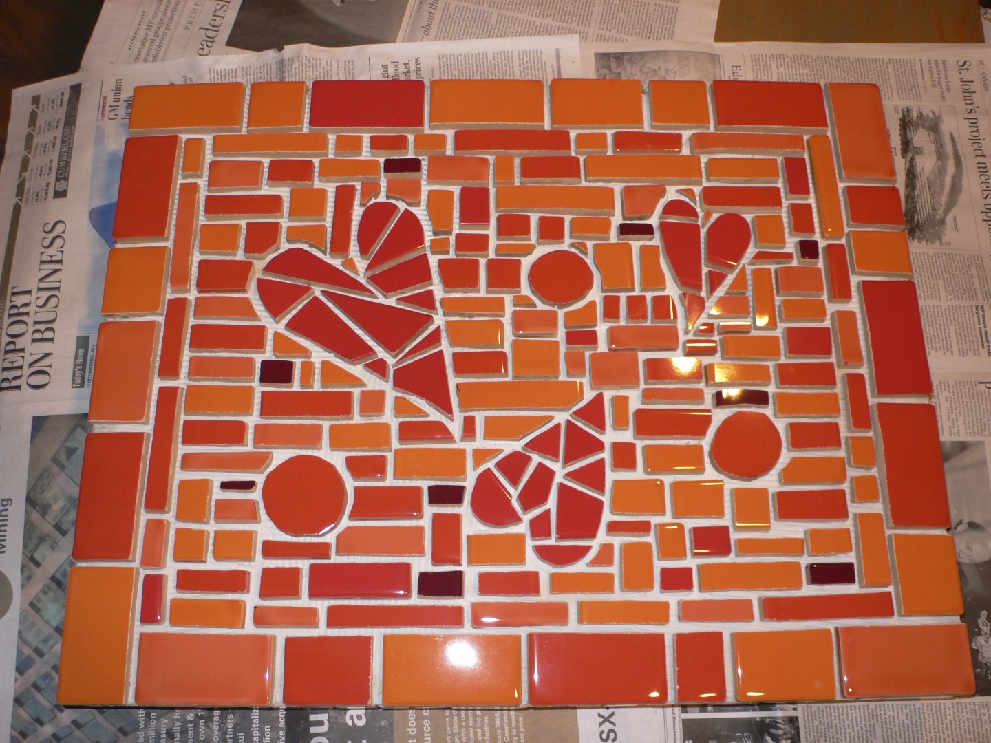 The second cart was much easier for me. The theme that year was “From the Heart” so I could work in colors that I love. These tiles were leftovers from my daughter’s kitchen renovation in Montreal. Now there’s a project to share another day. See how different the tile looks once the grout is in place.