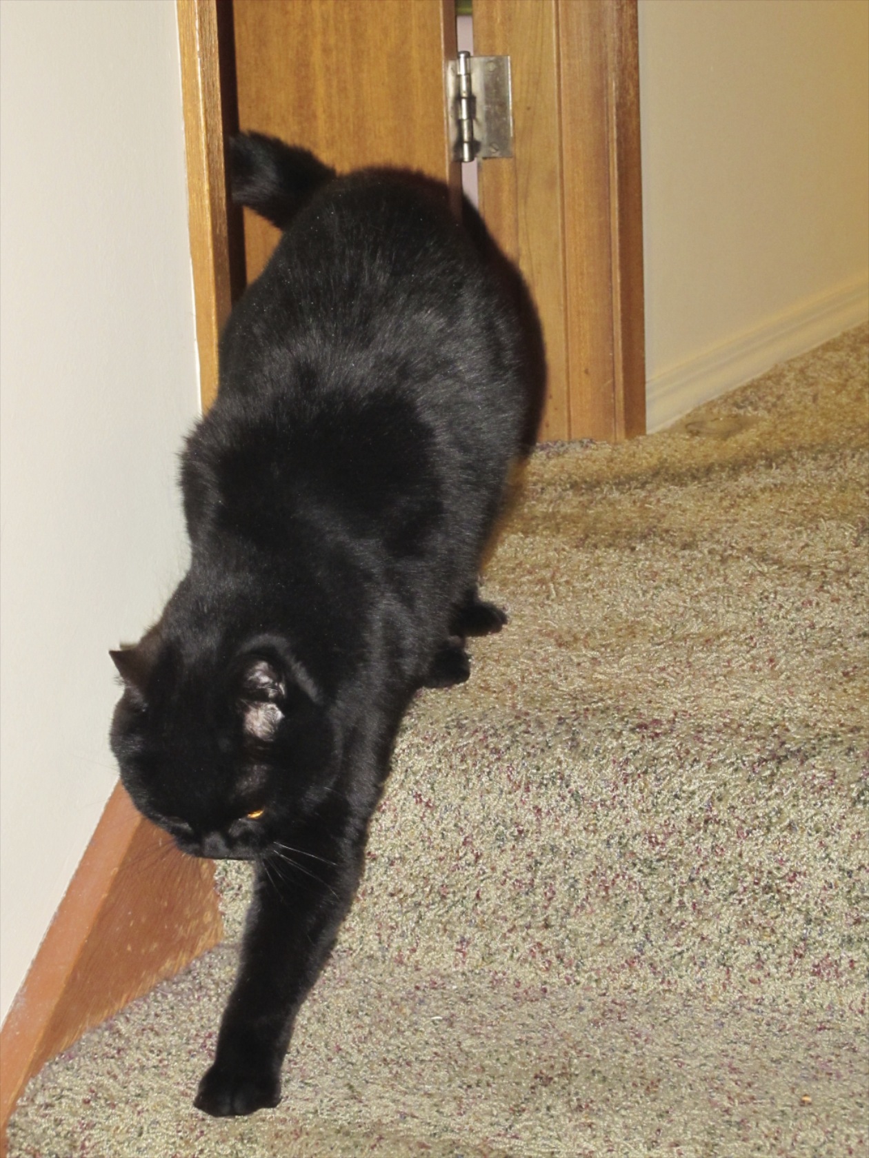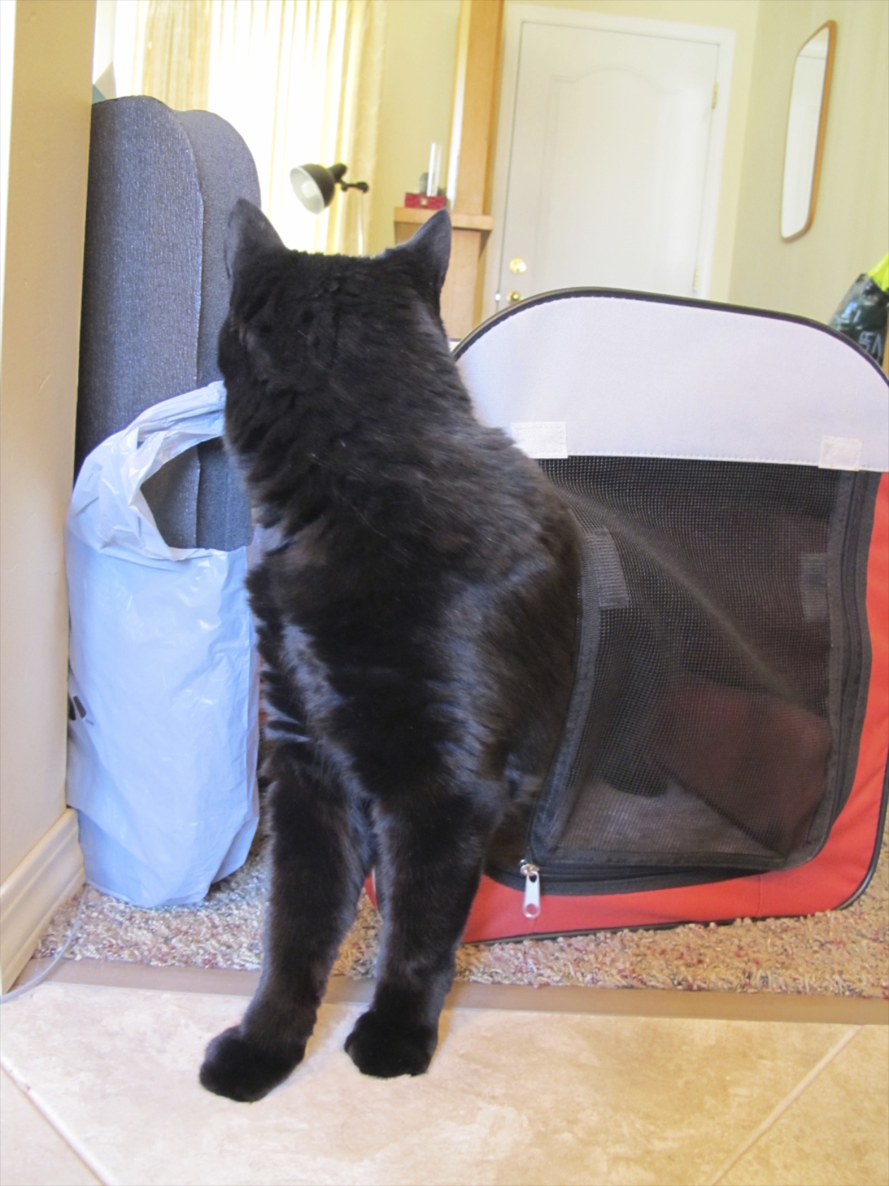 I carried Felix in his carrier into my parents’ house. I opened the door part way so he could display his escape techniques. He immediately set about exploring the house.