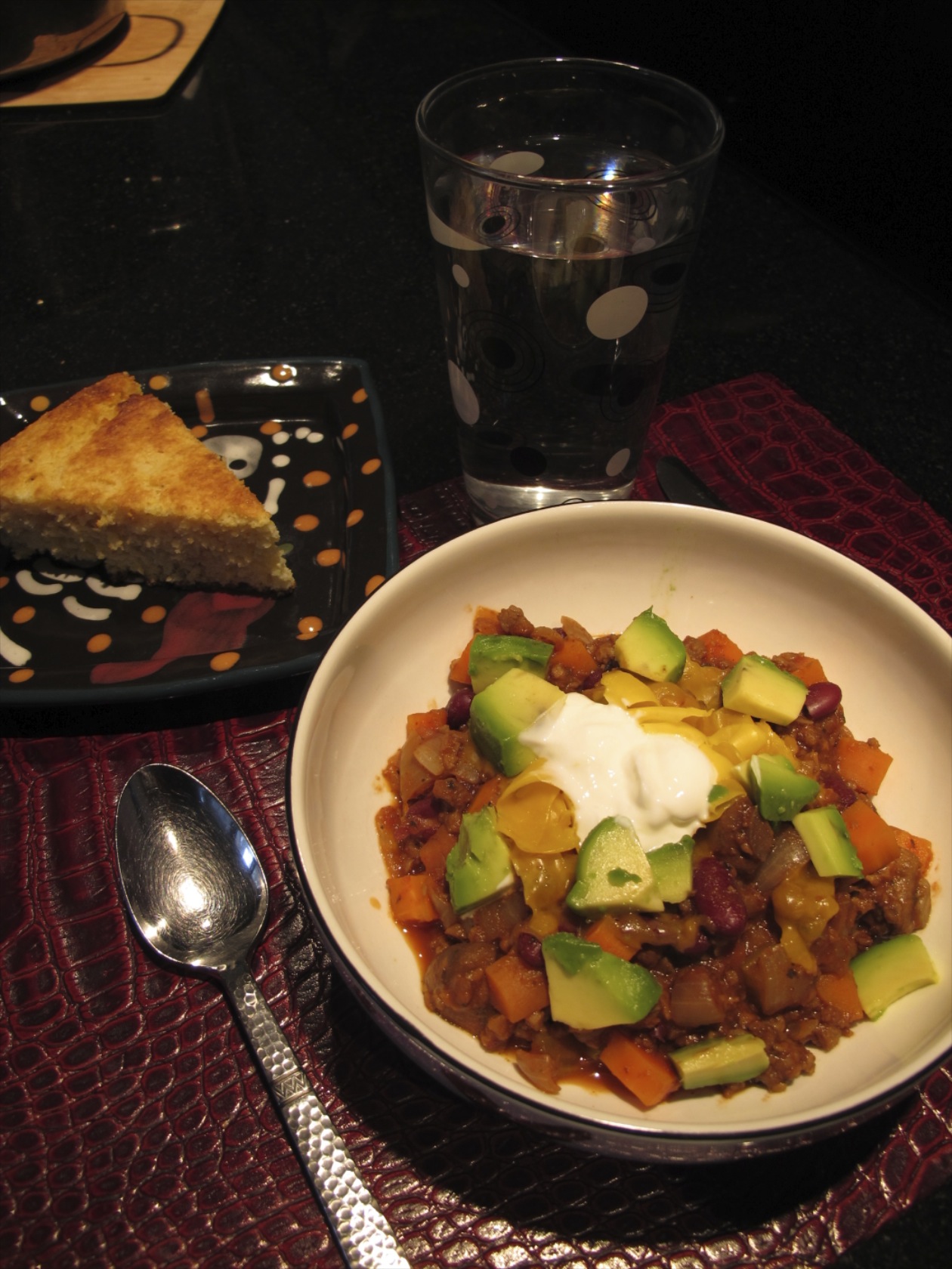 1. Sounds super! And I love that you paired it with avocados, yogurt, cornbread 🙂 I like cornbread a lot- savory or sweet. My Maman (true Southern lady) thinks sugar in cornbread is close akin to blasphemy 😉