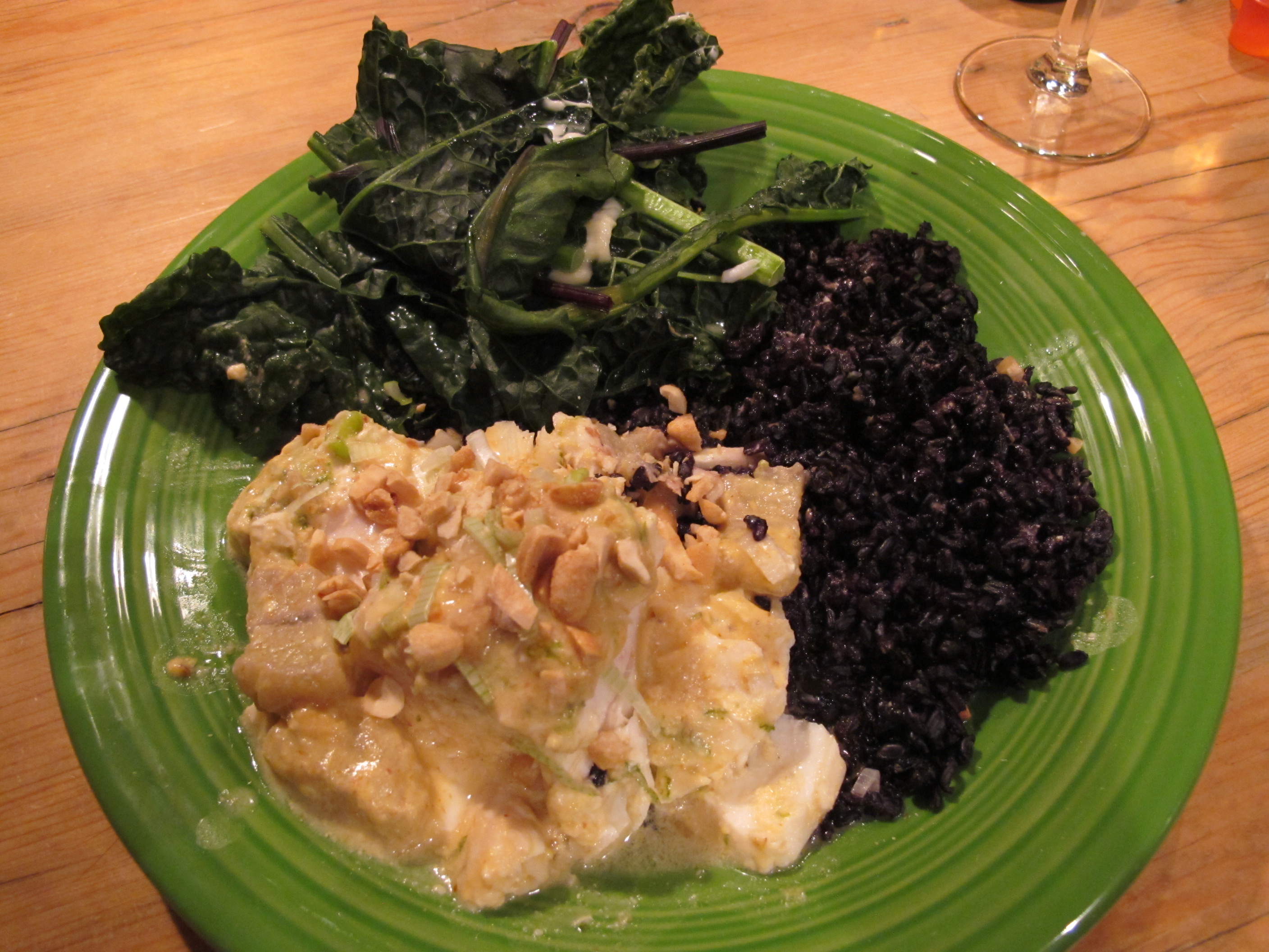I made a few changes. I doubled the amount of fish and most of the other ingredients. I forgot to cut the halibut before cooking so it took longer to finish, but I’ll remember next time. The fish in the photo was cut into 4 pieces after cooking, before serving. I recommend “Mae Ploy” brand Thai red curry paste, and don’t be skimpy with it. I didn’t have any scallions (green onions) so I used a bit of chopped yellow onion. I skipped the cilantro. I never just “have it on hand” because I don’t like it. This was served with black rice and steamed dragon kale. The fish and the sauce were unbelievably delicious. I almost hesitate to post this recipe before I’ve had a chance to impress my friends with it, but that’s the kind of person I am – always willing to share. Of course, I also don’t think my friends will read this and immediately make it. I’m not even sure they will read this.