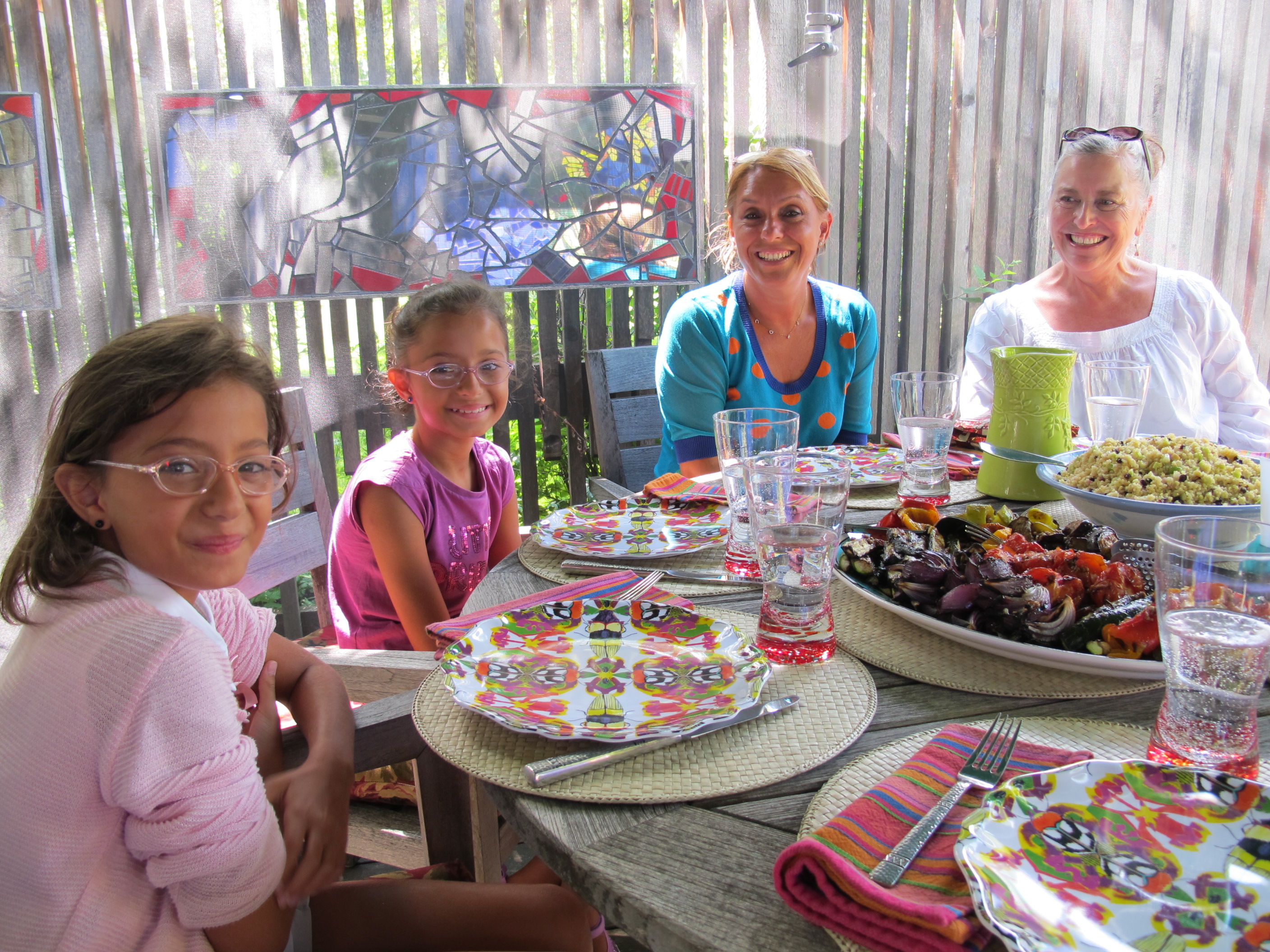 Speaking of cuties, take a look at these veggies. I dare you to show me a better looking plate of vegetables. I mean really, isn’t it beautiful? (I can only talk this way because we’re friends.) We dined on the deck. The vegetables turned out well (the onions were unbelievably sweet). I thought some lightly dressed greens would be nice along with a simple quinoa salad. I was even almost ready when everyone arrived!
