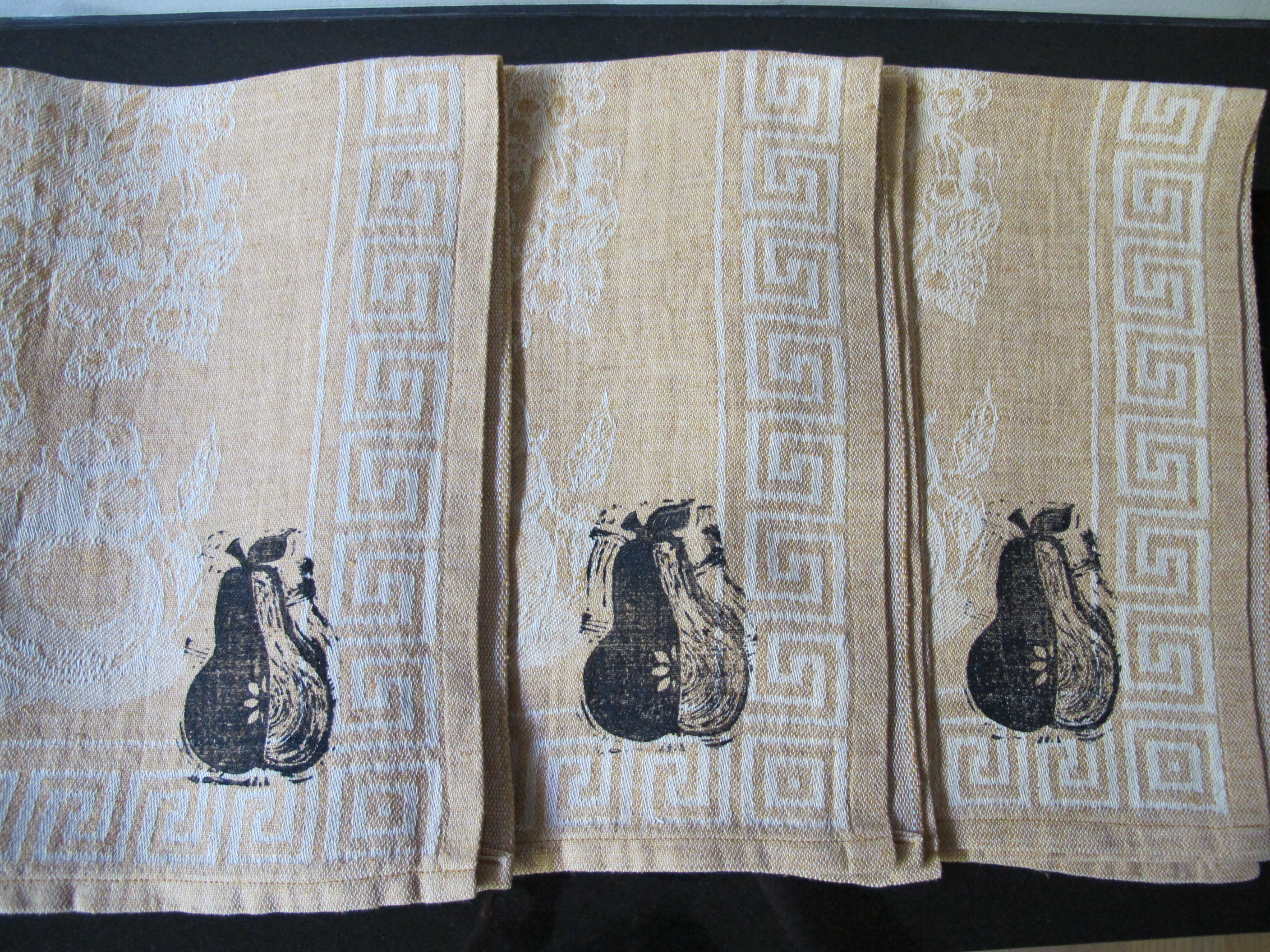 Someone suggested that I print a variety of fruit images. (People who don’t have to do the work are always full of suggestions.) Next I transferred the image to my stamping material, carved the stamp and went to work with some textile ink. This is how the tea towels turned out:
