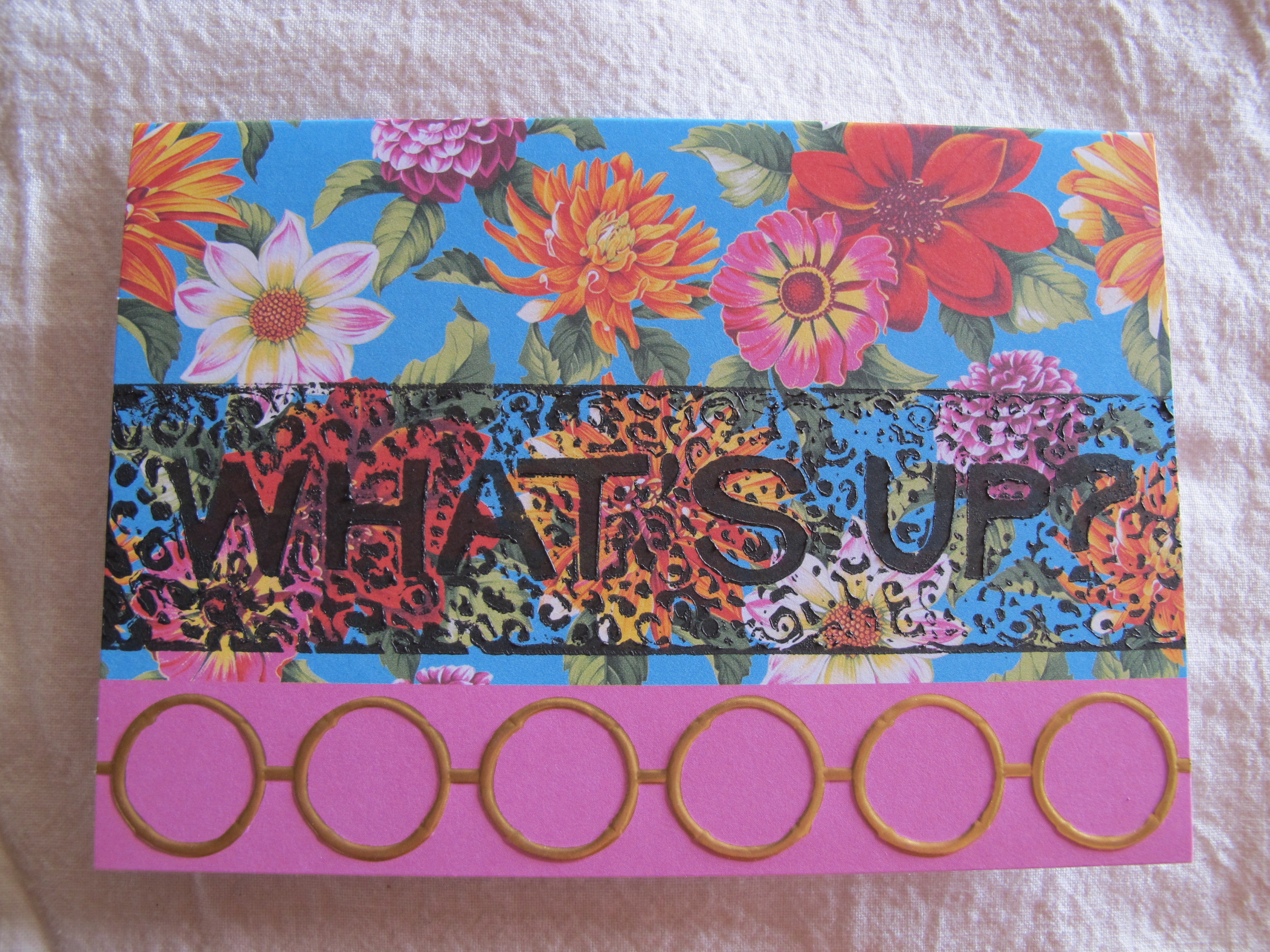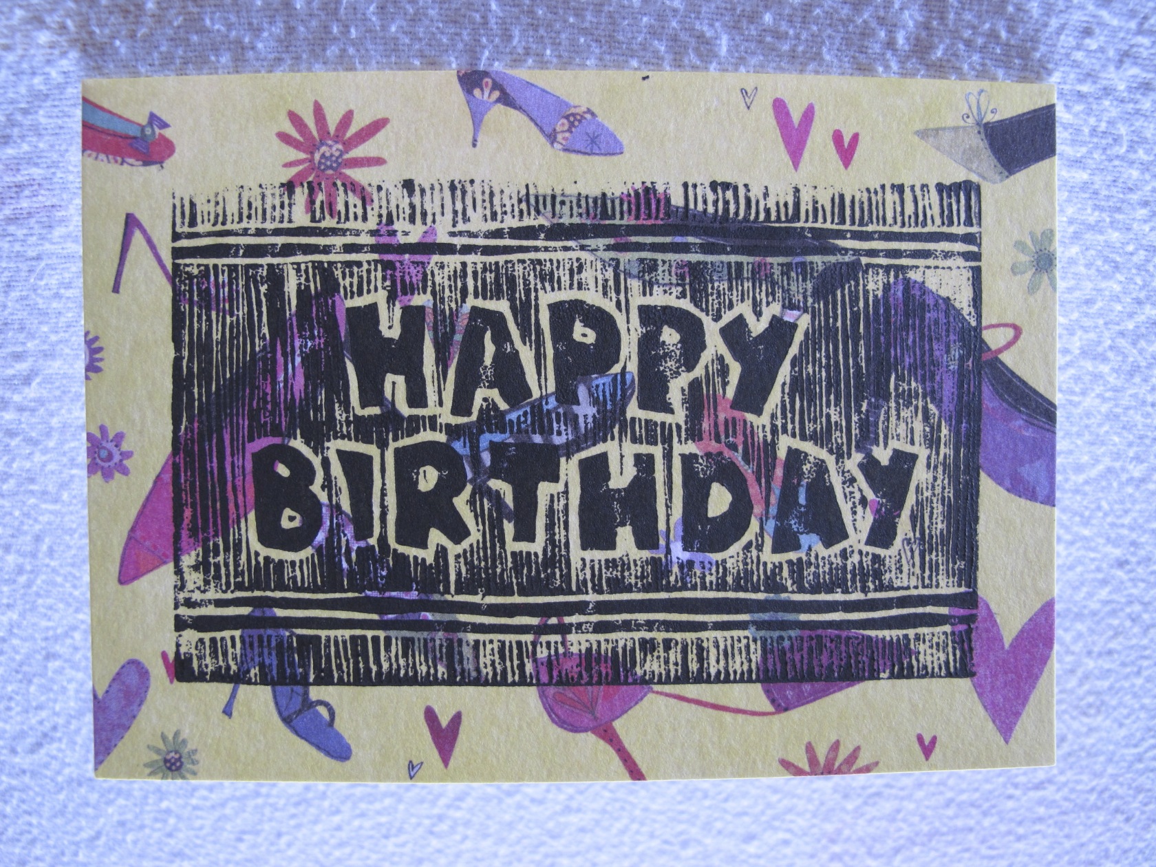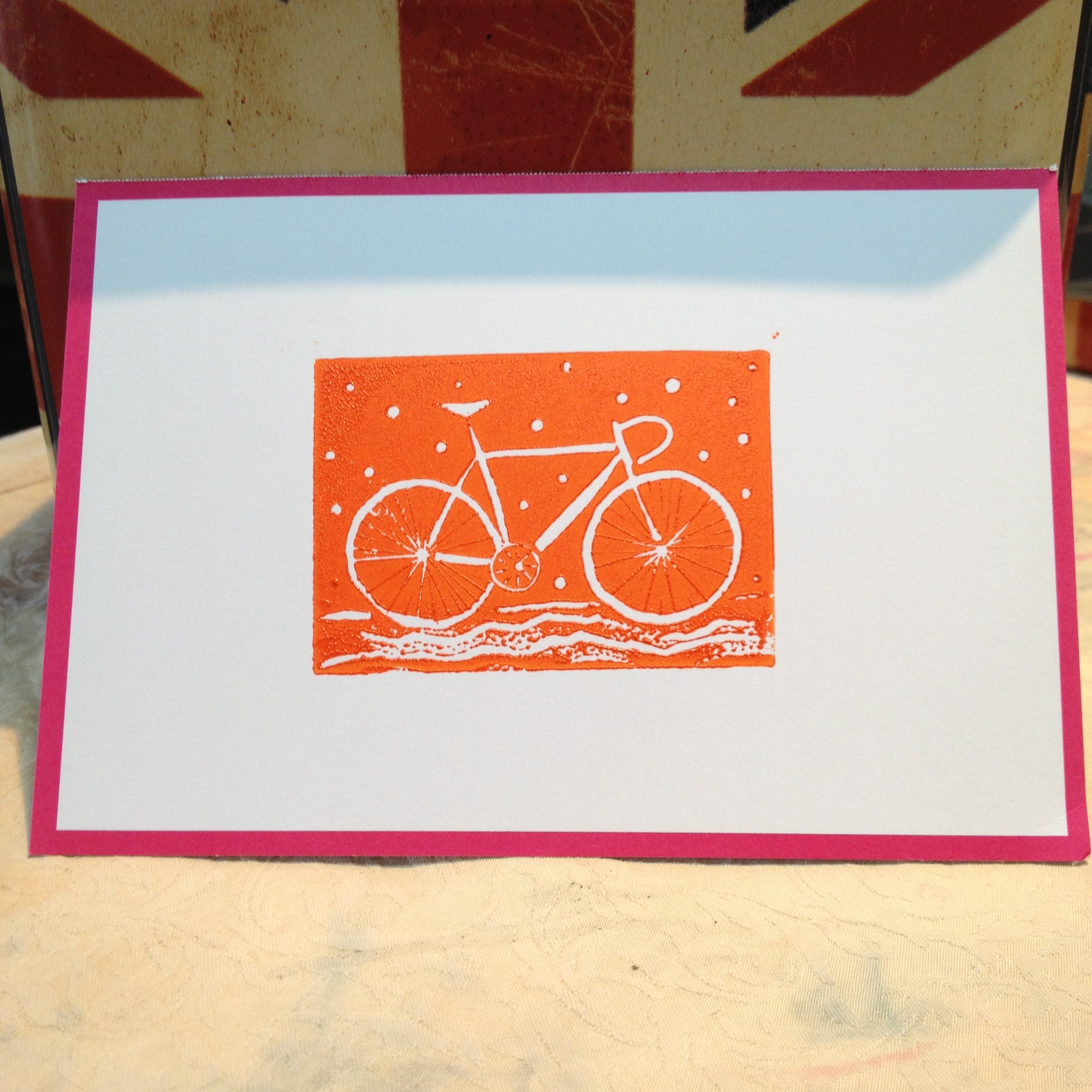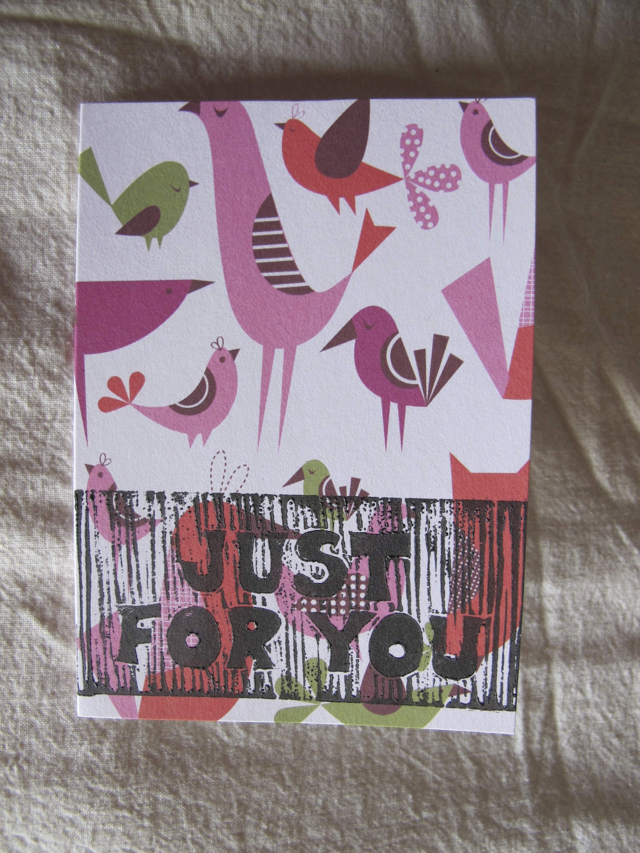 I’ve been printing cards. I love the process – the designing, carving, printing and best of all – looking at the finished product. Sometimes the process goes smoothly, sometimes not so much. I’m still learning (and there is a lot to learn) but I’m having a great time doing so. I print on cards that I purchase – some are just plain paper (white or cream), some are simple backgrounds which are intended forΒ “embellishment”. I also like to work on cards that other people would consider finished or ready to use. The challenge is to improve upon an already great looking card.