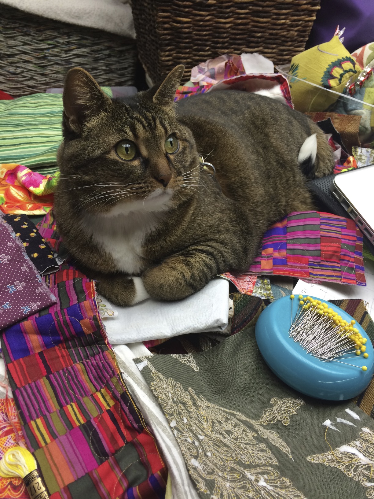 Here are a few shots to show you what I’ve been up to, in case you don’t follow me on Instagram or Facebook. If you already do, I apologize for the repetition.Kush in a basket shields for DFG printed tea towel printed items Kush watching me in the studioDrat – wanted to put some explanations in for the photos, but I’m out of time. Apparently my flight won’t wait for me! So welcome back and thanks for sticking with me.